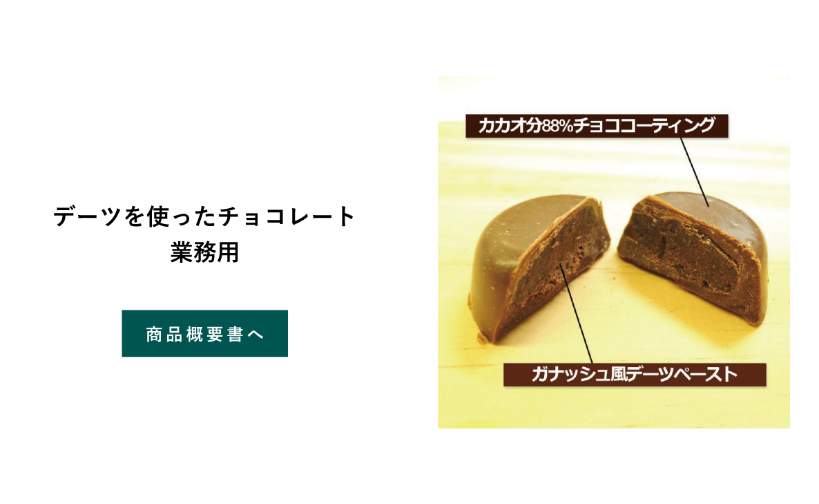 デーツの天然の甘さを活かしたガナッシュ風チョコでは、デーツペーストがメーカーさんで採用されました。業務用商品としてOEM製造も可能です。
